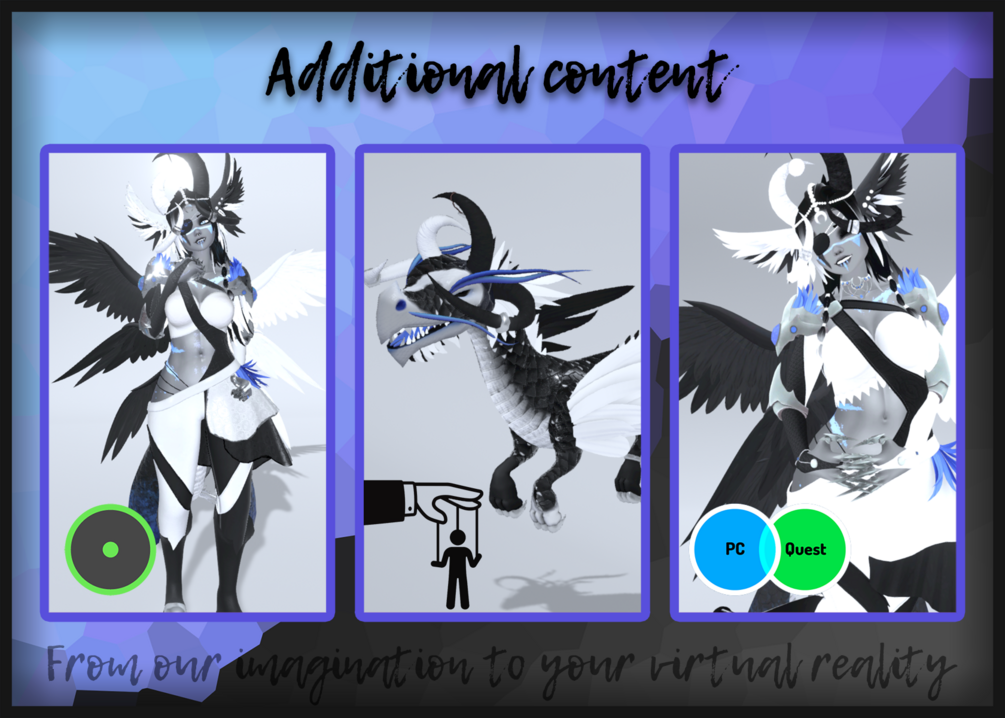 - Interactions: Proper Physics & Collisions that adjust with body shapes, Headpet, Nose boop, Chest touch, Grabable & Slidable clothing parts (PhysBones), Wing Idle animation, Wing Puppet, Tail Puppet