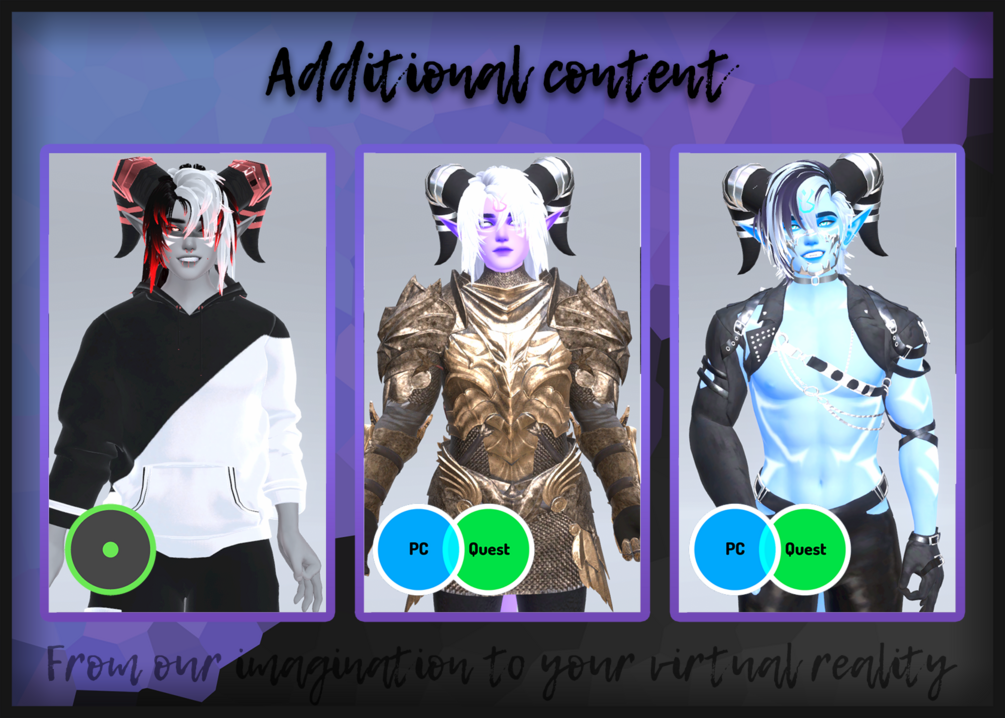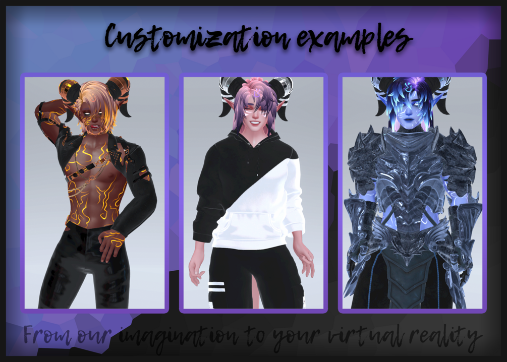 You'll get unity packages, explanations and a render to use as an upload picture for all the different versions of the selected bundle to enjoy this avatar on PC and Quest!