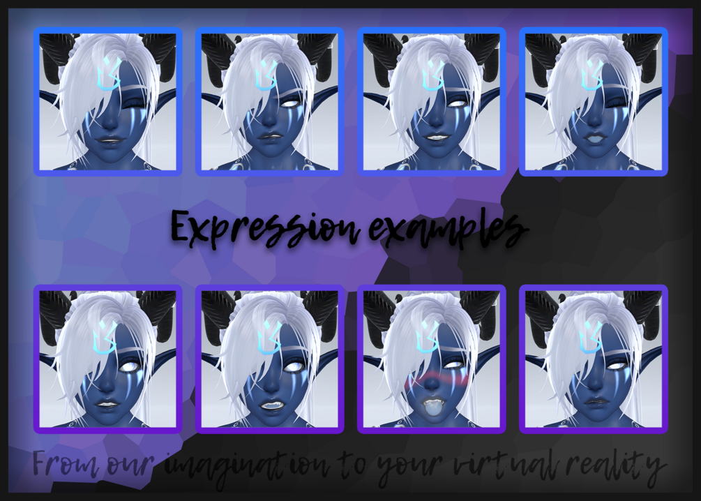 - 12 different expressive gestures : Slow Blink via Trigger (Fist R, Fist L), Happy (Open R), Sleepy (Open L), Confused (Fingerpoint R), Sad (Fingerpont L), Shy Flirty (Victory R), Confident Flirty (Victory L), Annoyed (RockNRoll R), Angry (RockNRoll L), Smug (Handgun R), Timid (Handgun L), Surprised (ThumbsUp R), Blep (ThumbsUp L), Breath particles toggle for Flirty, Heart particles toggle for Headpet & Tummy Rub