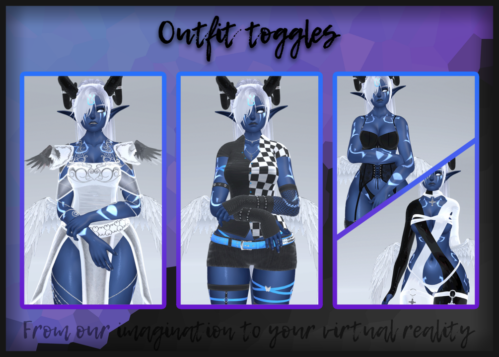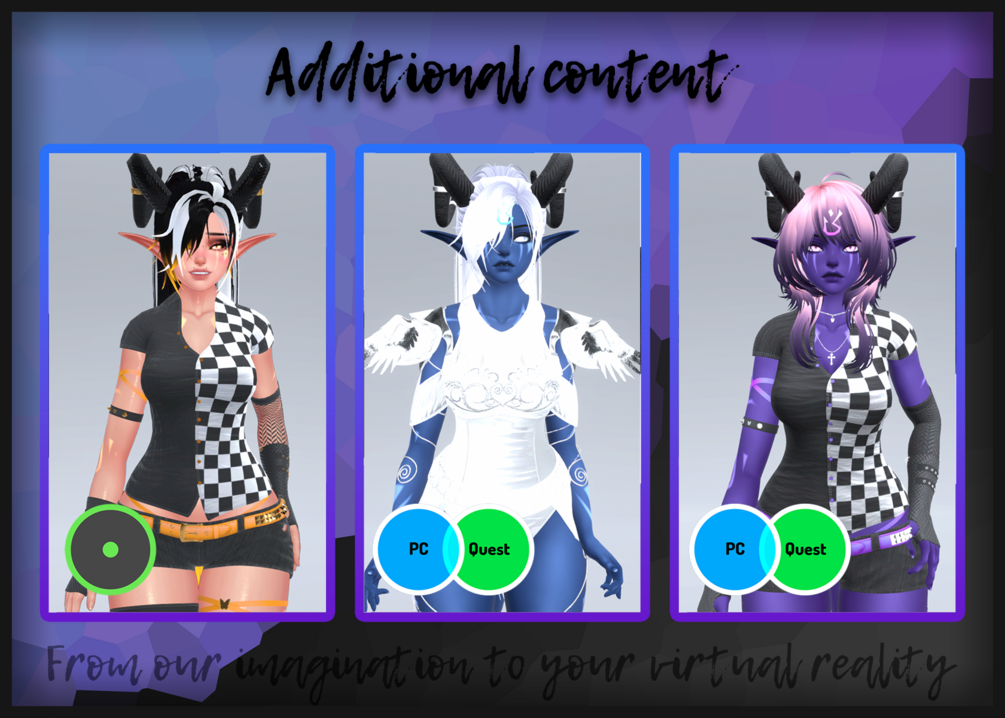 You'll get unity packages, explanations and a render to use as an upload picture for all the different versions of the selected bundle to enjoy this avatar on PC and Quest!