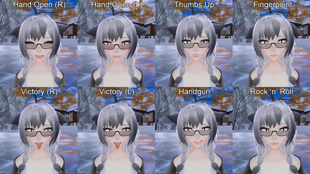 ❱❱▶ Custom expressions and ear movements: Happy (Open R), Timid (Open L), Sad (Fingerpoint), Shy Flirty (Victor R), Confident Flirty (Victory L), Angry (RockNRoll), Smug (Handgun), Surprised (ThumbsUp R), Blep (ThumbsUp L)