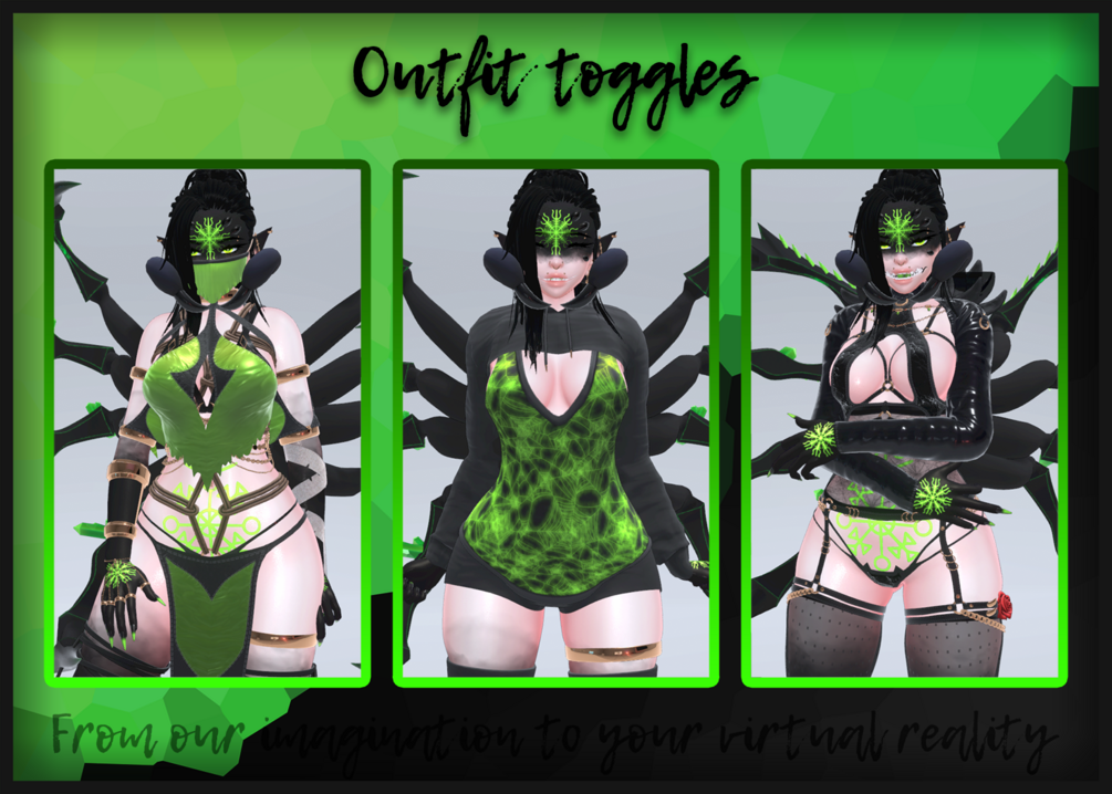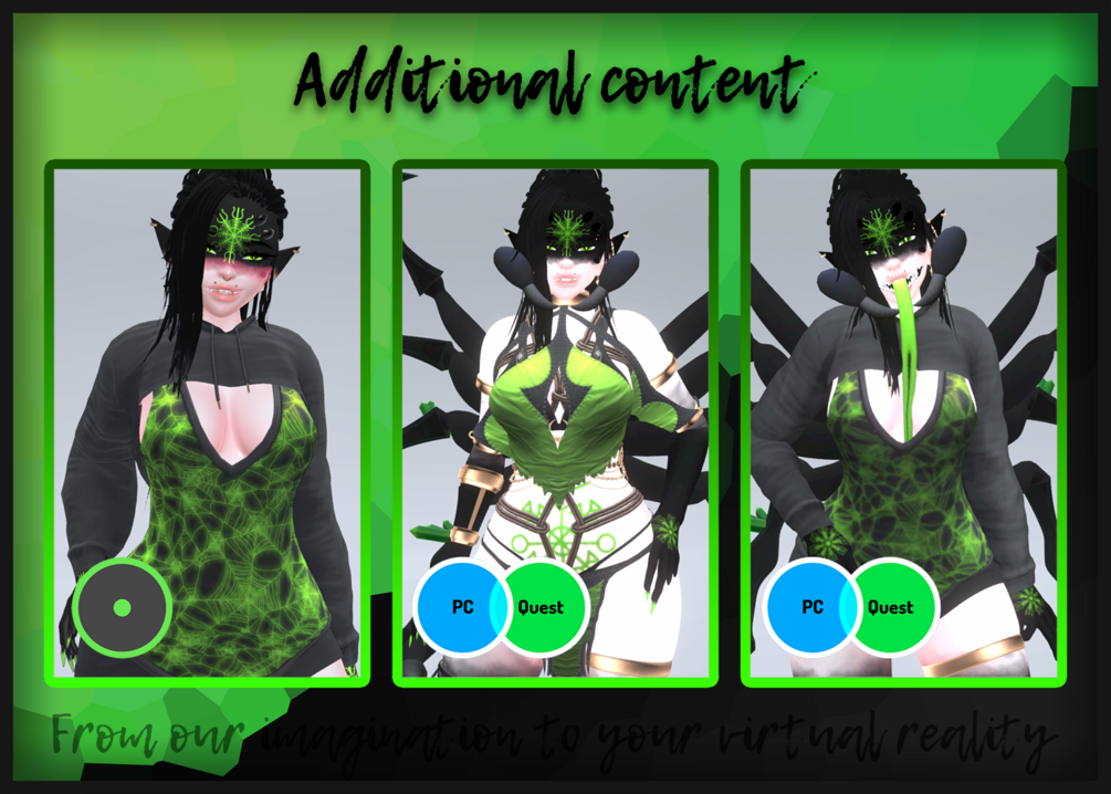 - Interactions & Idles: Face Idle, Spider Limbs idle, Limb Puppet, Tongue Puppet, Proper Physics & Collisions that adjust with body shapes, Contact Toggles, Expression Particles Toggle, Headpat, Nose boop, Ear pull, Tummy rub, Chest touch, Neck touch, Slap