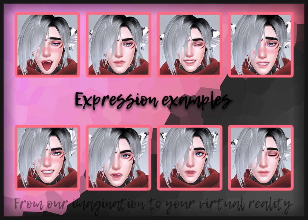 - 12 different expressive gestures : Slow Blink via Trigger (Fist R, Fist L), Happy (Open R), Sleepy (Open L), Confused (Fingerpoint R), Sad (Fingerpont L), Shy Flirty (Victory R), Confident Flirty (Victory L), Annoyed (RockNRoll R), Angry (RockNRoll L), Smug (Handgun R), Timid (Handgun L), Surprised (ThumbsUp R), Blep (ThumbsUp L), Breath particles toggle for Flirty, Heart particles toggle for Headpet
