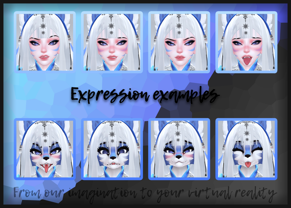 - 12 different expressive gestures : Slow Blink via Trigger (Fist R, Fist L), Happy (Open R), Sleepy (Open L), Confused (Fingerpoint R), Sad (Fingerpont L), Shy Flirty (Victory R), Confident Flirty (Victory L), Annoyed (RockNRoll R), Angry (RockNRoll L), Smug (Handgun R), Timid (Handgun L), Surprised (ThumbsUp R), Blep (ThumbsUp L), Breath particles toggle for Flirty, Heart particles toggle for Headpet & Tummy Rub