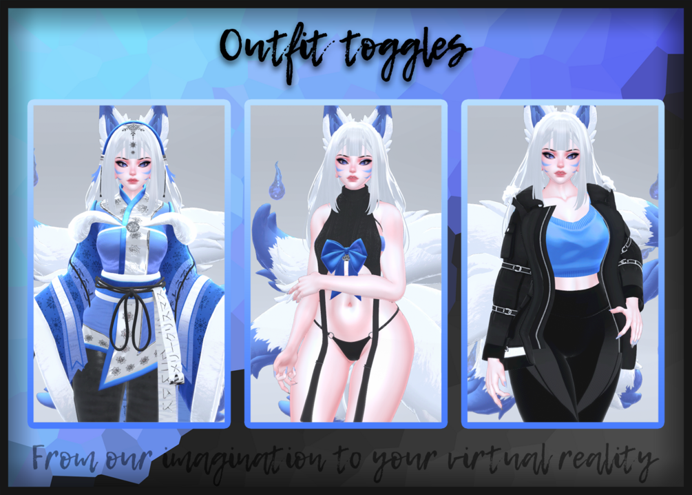 - Interactions & Idles: Face Idle, Ear Idle, Tail Puppet, Proper Physics & Collisions that adjust with body shapes, Contact Toggles, Expression Particles Toggle, Headpat, Nose boop, Ear pull, Tummy rub, Upper Body, Neck touch, Lower Body